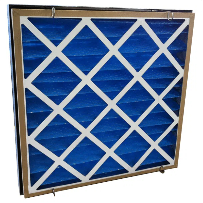 Air filter frame clips help secure filters and facilitate replacement. A filter frame has four retaining P-clips and a foam gasket to which the panel or bag filter seals.
